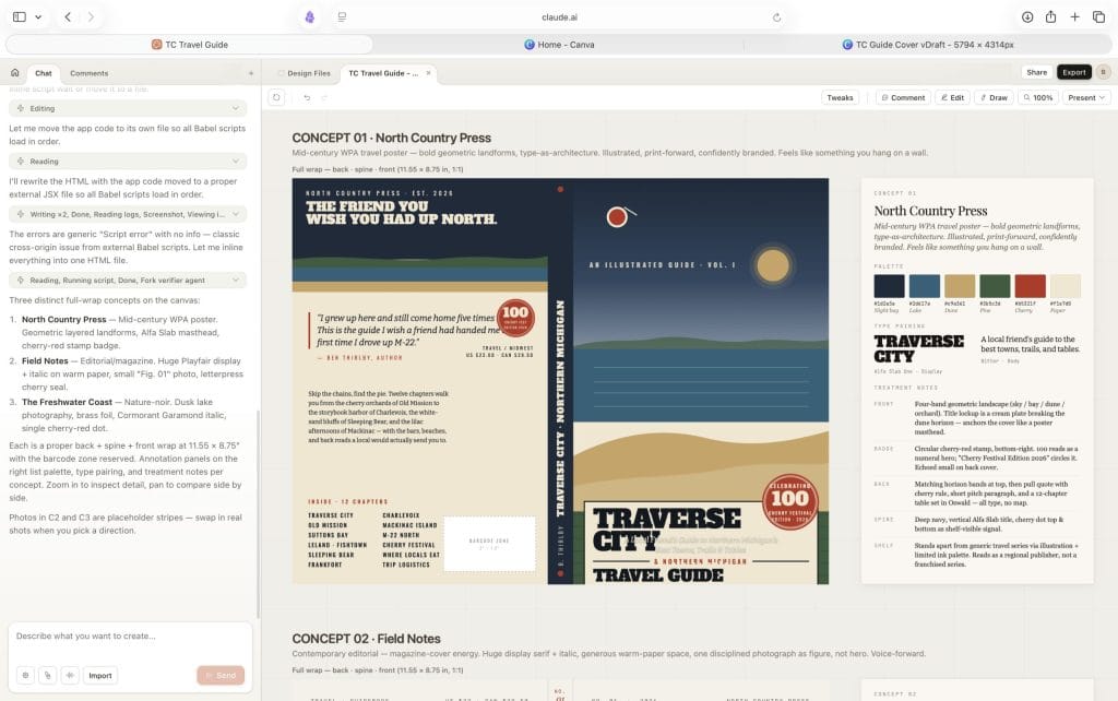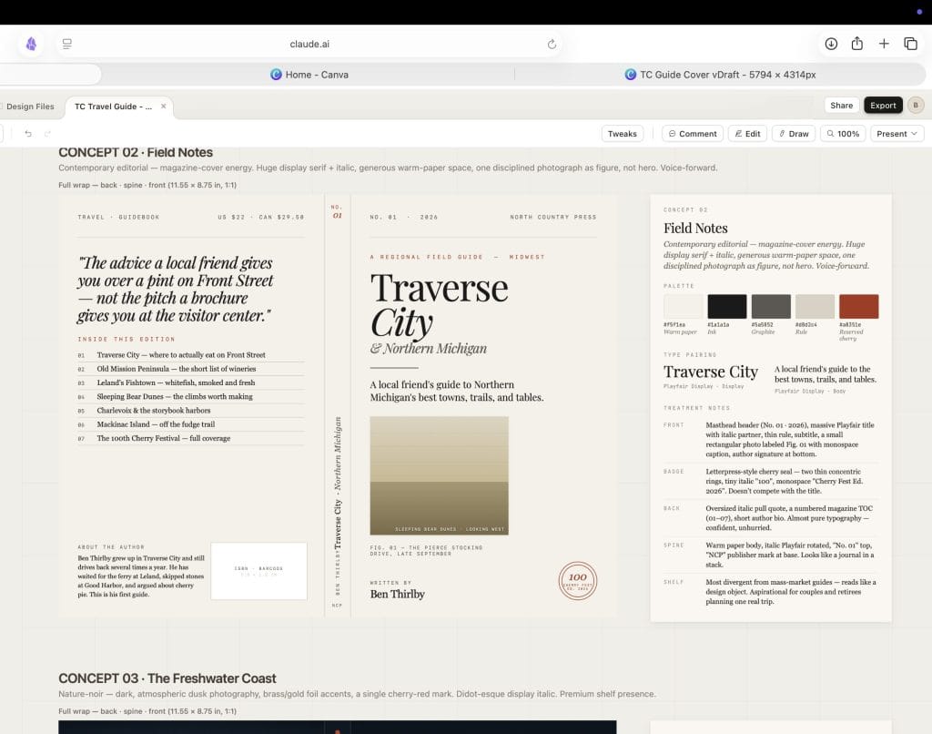 I’m currently writing a regional travel guide for Northern Michigan — Traverse City and the surrounding area. I needed cover concepts. Hiring a designer wasn’t in the budget, and I’d been going back and forth in Claude Code trying to describe aesthetic things I couldn’t quite articulate. So I tried Claude Design instead.
