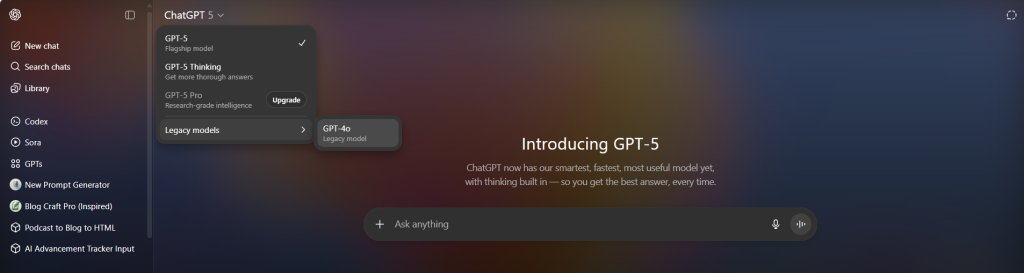 After enabling the setting, start a new conversation or refresh your current one. Click the model dropdown at the top of the chat interface (where it says “GPT-5”), look for “Other models” or “More models,” and you should now see GPT-4o listed as an option.